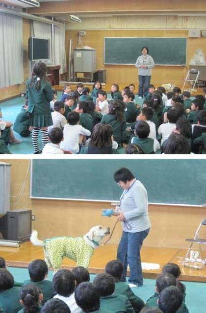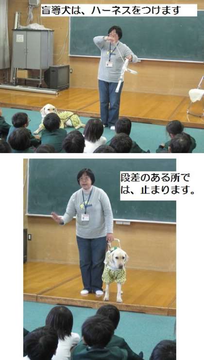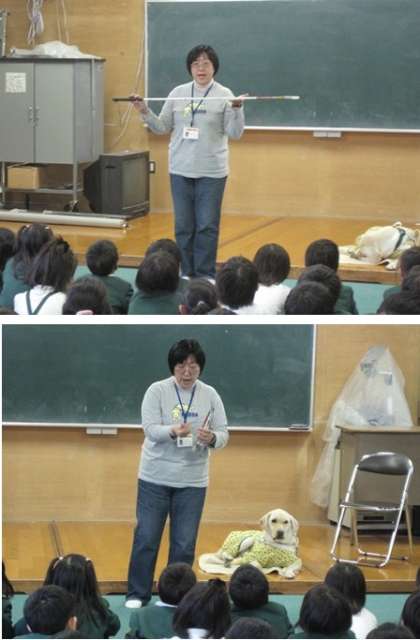最初に、目が不自由とはどんなことなのか、子どもたちにもわかりやすいようにお話をしてくださいました。その後、盲導犬の役割や、訓練の仕方について教えていただきました。