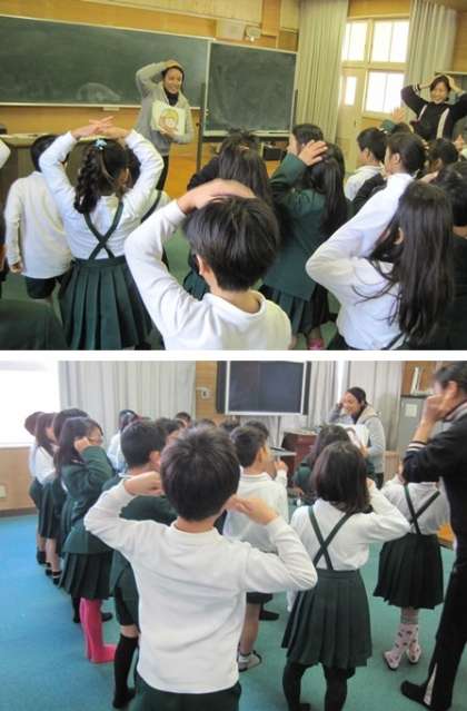 最初は絵カードを使って、頭や肩、ひざ、つま先などの発音を練習した後、