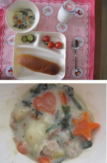 ※今日もシチューの中にハッピーにんじんがたくさん入っていました。シチューを食べるとき子どもたちはにんじんを見つけては大喜びしていました。