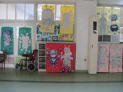 保健室の前に、手洗いうがいカード(台紙)が勢ぞろいしました。