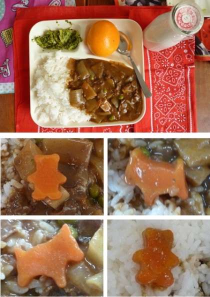 今日の冬野菜のカレーライスには、れんこんとだいこんが入っています。どちらも今が旬の野菜です。かわいらしい「クマ」と「犬」の形をしたラッキーにんじんも入っていました(^O^)
