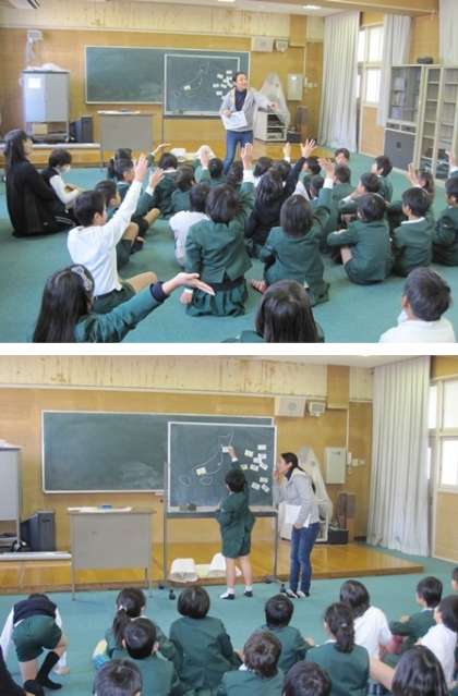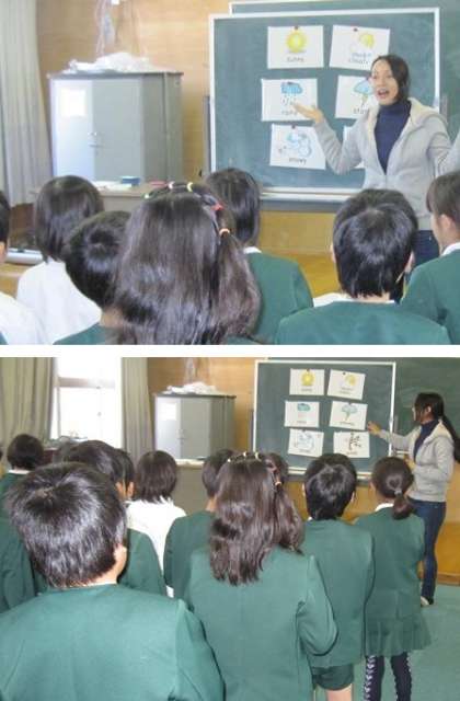 「ふし」に合わせて、ジェスチャーもつけて 天気を表す英語の発音を練習した後、大阪の天気は?など質問に答えながら楽しく勉強していました。