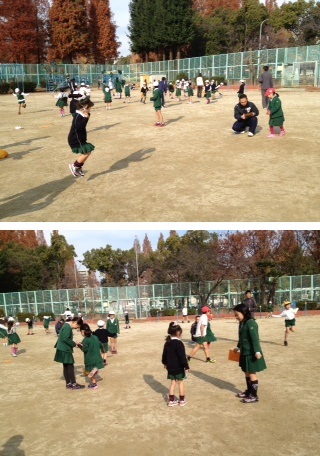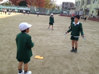 また、低学年は、その場で跳ぶのが難しく、跳びながらだんだん移動していってしまう児童がいます。検定役にあたっている体育環境委員会の児童の中には、移動していく1年生に合わせて一緒に移動しながら検定をしてあげる優しい児童もいました。