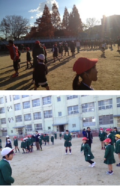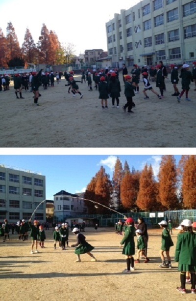 各班、高学年の児童が、低学年の児童でも跳びやすいように。。。と配慮しながら、なわを回していました。