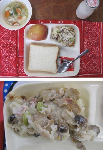 今日の「きのこのドリア」に、しめじやマッシュルームと一緒に入っています。