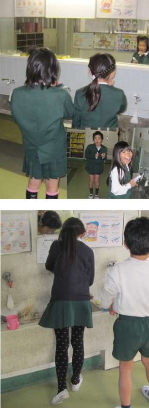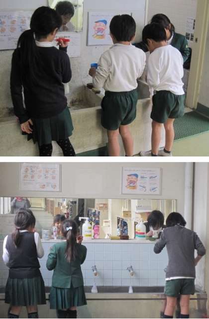 みどり小学校では、歯みがき週間中でなくても、子どもたちは毎日歯磨きセット(歯ブラシ・コップ)を持って登校しています。だから、この風景は特別のものではなく日常の風景と同じもです。