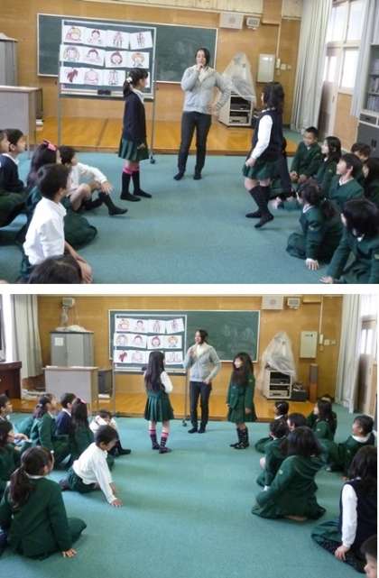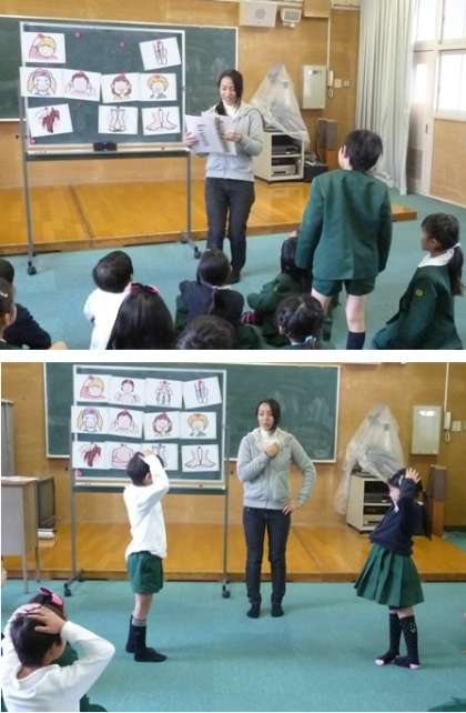 頭・肩・ひざ・つま先・うで・目・口・鼻・耳などを英語を教えてもらい