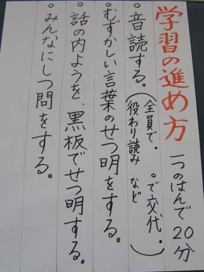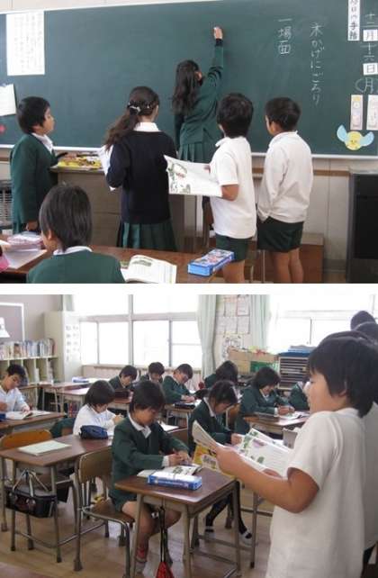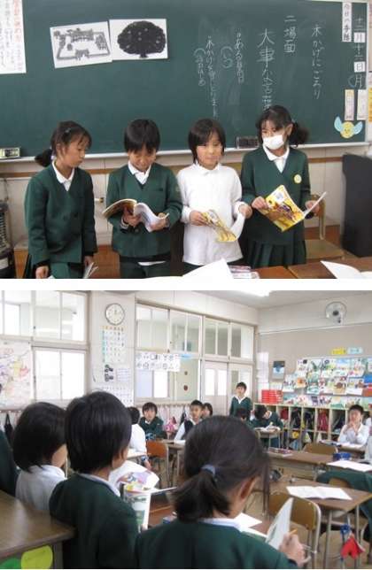 国語「木かげにごろり」全部で6場面のお話です。3年1組の児童が6つのグループに分かれて、各場面ごとに発表をしていきます。今日は第1場面と第2場面の発表をしました。