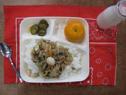 うずら卵は、中華丼に入っています。うずら卵が好きな児童が多いので、配食するとき、当番の児童は、なくべく公平になるように気をつけて配っています(笑)