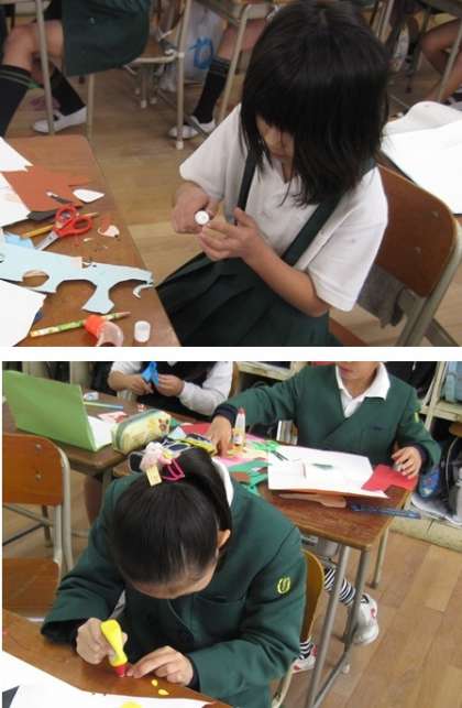 小さい紙を丁寧にのりで貼り付けながら、細かいところを工夫してカード作りを楽しんでいました。