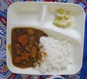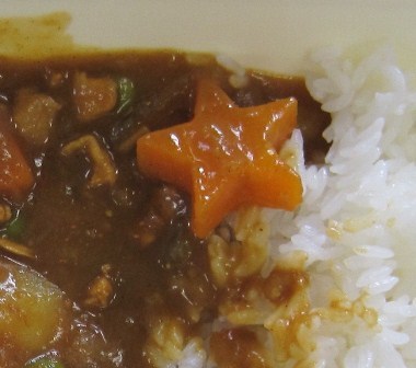 しかも、今日はカレーのルーの中に、星型やハート型のニンジンがありました。みんな自分のルーの中に入っていないか 楽しそうに探しながら食べていました(^O^)
