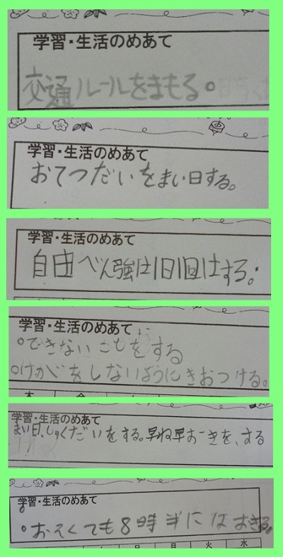 「おてつだいをする」や「交通ルールを守る」「早起きをする」など子どもたちはあれこれ悩みながら自分のめあてを決めていました。