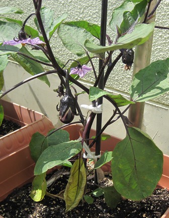 なすびは紫色の花をたくさん咲かせ、長さ5センチメートルほどの小さな実がなりはじめました。