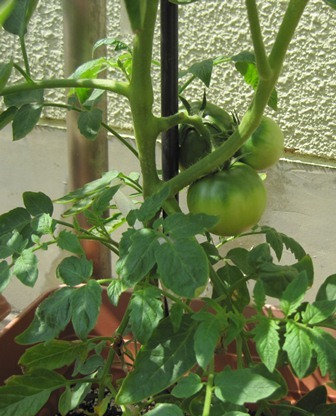 トマトは、直径4センチメートルほどの青い実をつけていました。