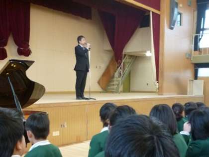 講堂で始業式が行われ、新しくみどり小学校に転校してきたお友だちを拍手でむかえました。