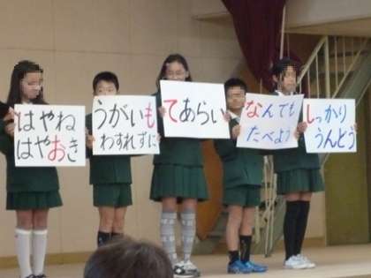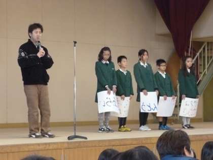 保健委員会の児童も手伝って、最後にそのプラカードを並べ直すと、なんと赤字で書いた部分が、「お・も・て・な・し」となるという サプライズもあって楽しいお話でした。