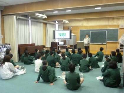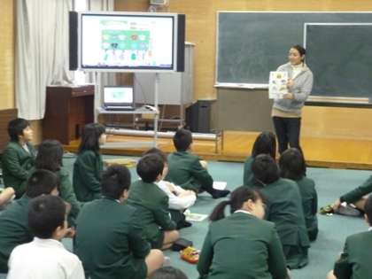 みんなで「what food do you like?」とリズムに合わせて3回言った後に、マジェサ先生が投げたボールを受けた児童が「I like ○○」と答えるゲームをしていました。