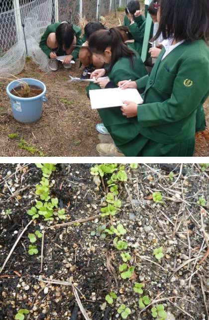 冬休み前に種をまいたアブラナが発芽したので、4年生が観察をしていました。