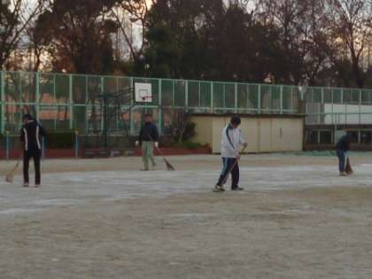 放課後、運動場ににがりをまきました。これは、地面が凍ってしまう(霜柱がたつ)のを防ぐためです。