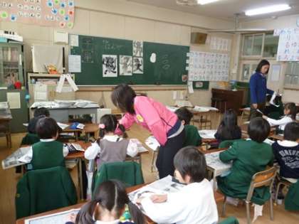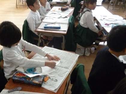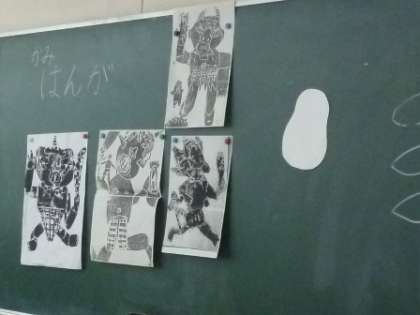 1年1組さんが紙版画を作っていました。どうやら「おにさん」の版画のようです。今日は、鬼の顔の輪郭を切り抜いて、怖そうな目を貼り付けていました。
