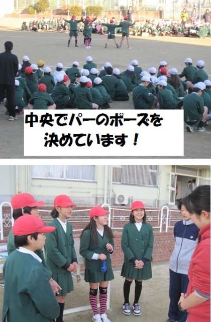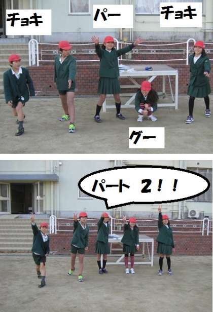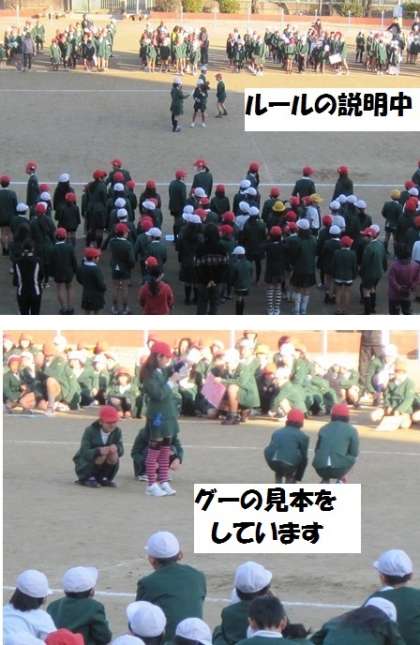 集会委員の児童は、みんなが理解しやすいように、大きなポーズでジャンケンの見本をみせていました。