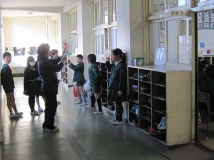 4年生の児童たちが、版画で彫りたい自分のポーズを考えて、担任の先生に写真に撮ってもらってました。