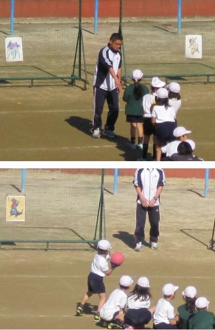 担任の先生が作った特製の的をまがけて 力いっぱいボールを投げていました。