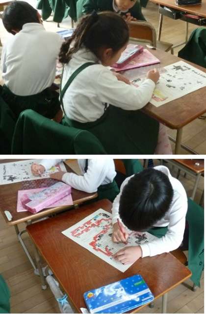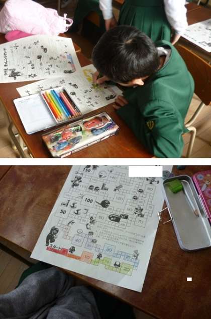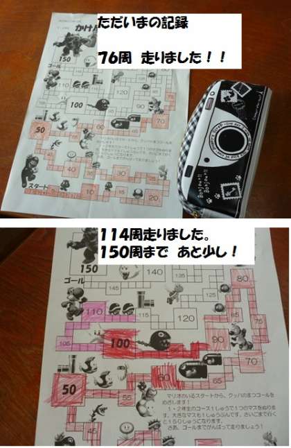 教室へもどった児童は、汗の始末をした後、自分が走った周の数だけチャレンジカードのマスをぬっていきます。
