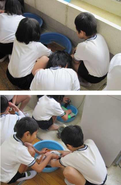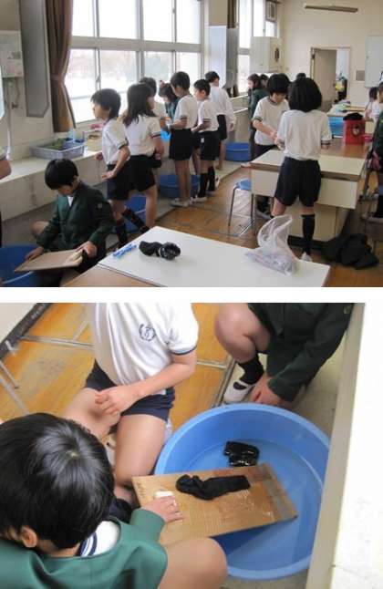3年生が「社会」の学習(昔の人の生活を学ぶ)で昔の洗濯の仕方を体験するために実際に洗濯板を使って自分の靴下を洗いました。