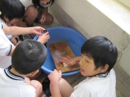 初めて洗濯板や洗濯用せっけんを見る児童も多く、おっかなびっくり おそるおそる洗濯を初めていました。