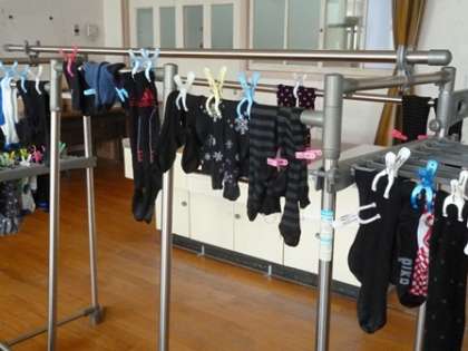 最後は、しっかり絞って、干しました。でも、床をよく見ると、靴下から垂れた水がありました。最後まで絞るのも難しいですね。
