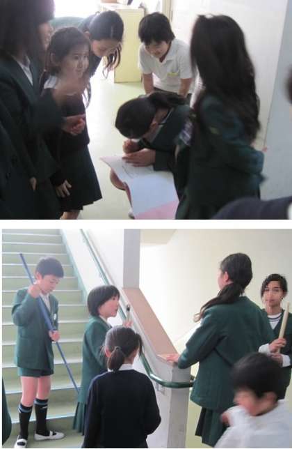 毎回清掃が終わった後は、リーダーを中心に反省会をしていましす。新しい場所に変わって2回目のたてわり清掃 きちんと役割を果たせたか確認中です。