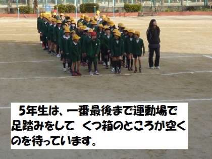 朝会が終わって 運動場から教室へもどるとき、3か所ある靴箱へ向かう順番が決まっています。