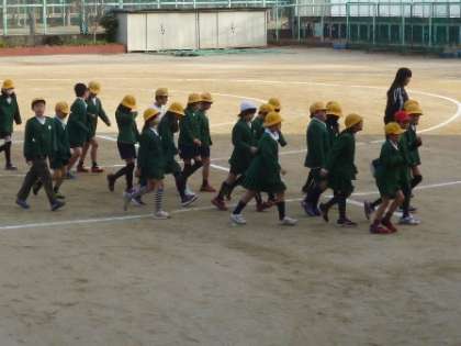 運動場で並んでいる位置などから、まず2年生と4年生が同時に出発し、その後、1年・3年・4年生が出発し、最後に 東入口近辺の混雑が緩和するまで待って、5年生が入口へ向かいます。