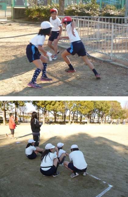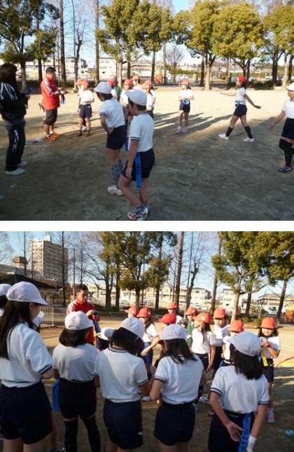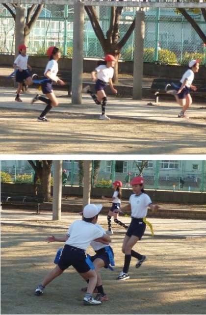 陸上クラブは、2チームに分かれて しっぽとりゲームです。腰につけた2本のタグを取られると仲間が助けにきてくれるまで復活できません。