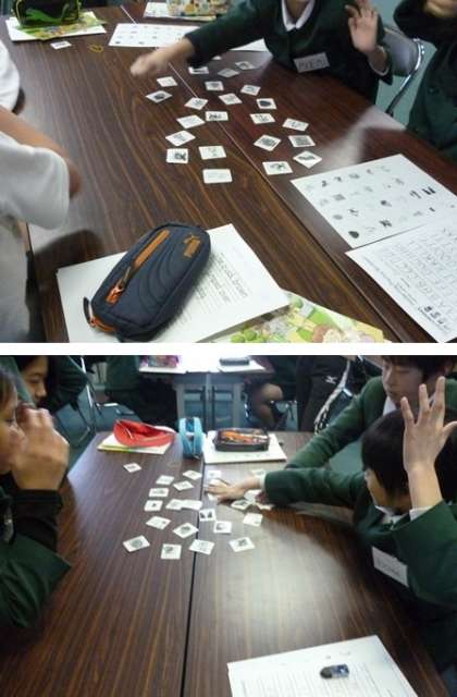 A〜Zで始まる単語の絵がかかれた26枚のカードを用意し、かるた取のときのようにテーブルに並べています。C−NETのマジェサ先生が発音した言葉のカードを取り合うゲームをしました。