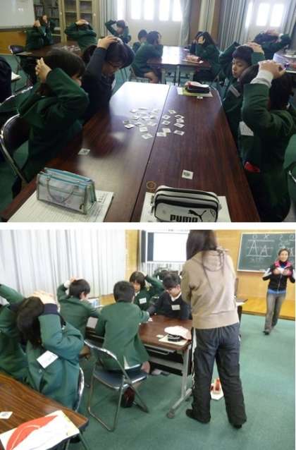 日本語でのゲームなら、言葉を聞いたとたんに、素早くカードを取り合う光景がひろがるのですが、英語だと・・・最初のうちは、言葉を聞き取っても、その意味は・・・何を英語で言った言葉かまず考えないといけないので 反応のグループもありましたが、だんだん慣れてくるとスピードも速くなり楽しそうに英語でかるたを楽しんでいました。