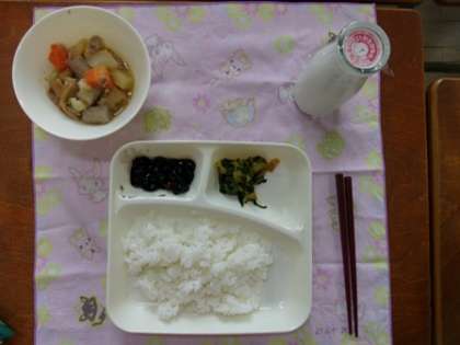 日本に昔から伝わる料理には、いろいろな豆が使われています。今日の給食に出てくる黒豆は大豆の仲間です。