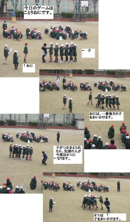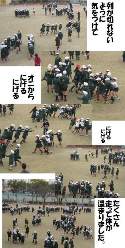 6年生がオニとなり、一列に並んだ他の学年を追いかける。ぐるぐる回ったので、寒い日でしたが、体がぽかぽかしました。。