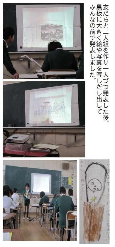 2組の発表では、プロジェクターを用いて一生懸命描いた絵を大きく映し出し、みんなに見せていました。一人での発表はとても緊張するものですが、大きな声ではっきりと話せていました。また、聞き手のほうも、うなずきながら真剣に発表を聞いていました。