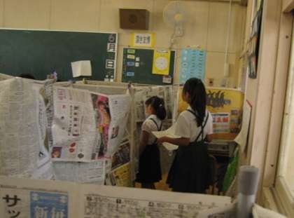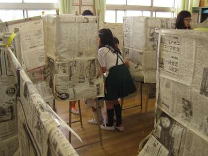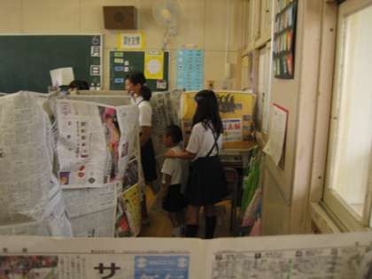 6年生が作った迷路を1年生が回ります。途中にクイズがあるのでそれに答えながら行きます。