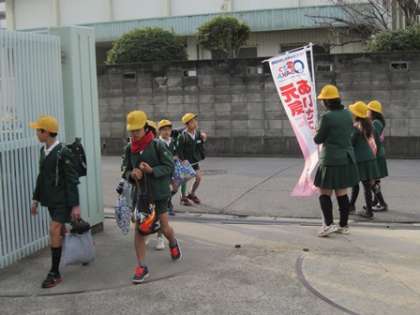 担当は体育・環境委員会です。体育・環境委員会の児童が「おはようございます」と声をかけると、登校してきた児童からも「おはようございます」と元気なあいさつがかえってきていました。