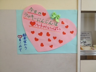 今日はバレンタインデー!給食室の入り口にこんな素敵な掲示がありました。