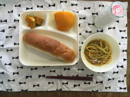 今日の献立:カレースープスパゲッティ かぼちゃのバター焼き 甘夏みかん レーズンパン 牛乳