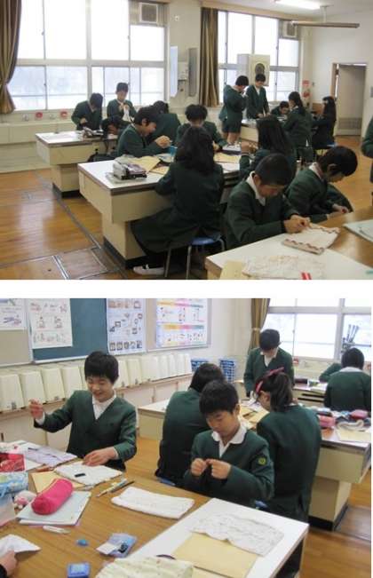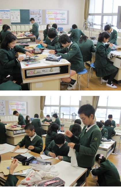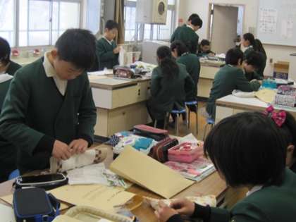 卒業お祝い集会のときに在校生にプレゼントするぞうきんを6年生が縫っていました。一人最低でも2枚は縫う目標でがんばっています。
