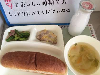 今日の献立:かつおのガーリックマヨネーズ焼き スープ グリーンアスパラのソテー ライ麦パン 牛乳