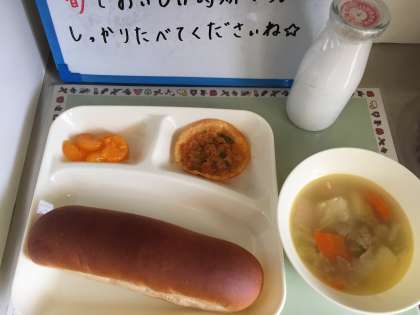 今日の献立:豚肉と野菜のスープ煮 変わりピザ みかん(缶) 黒糖パン 牛乳