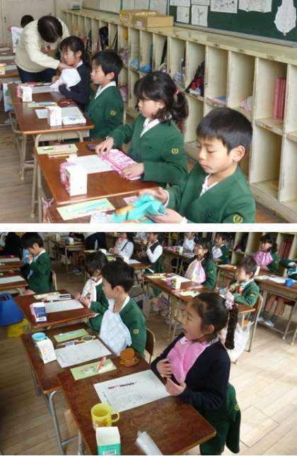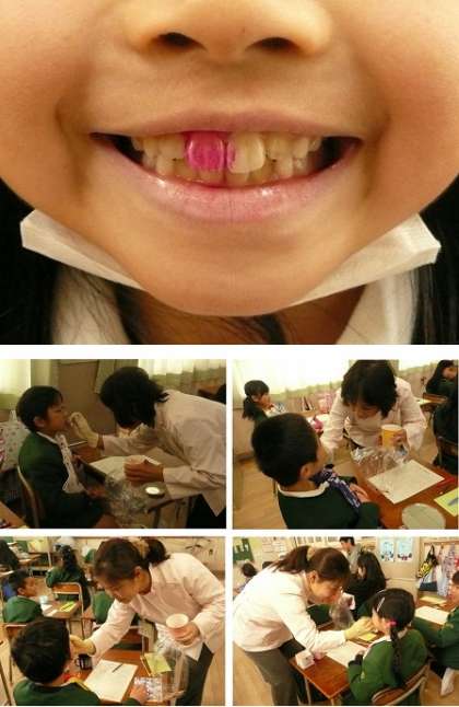 次に、朝の歯みがきで、みがき残しが無かったかチェックしていただきました。歯に赤い色をつけてもらったら水を口に含んで、くちゅくちゅくちゅくちゅ 歯についた染料がおちるようにうがいをします。