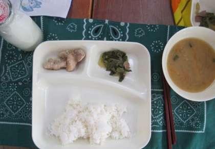 大阪市では、「天王寺かぶら」「田辺だいこん」「金時にんじん」「おおさかしろな」「毛馬きゅうり」「玉造黒門越瓜(しろうり)」「勝間(こつま)なんきん」「源八もの(芽じそ)」の8種類の野菜を「大阪市なにわの伝統野菜」としています。今日の給食では、おおさかしろなを煮びたしにしています。