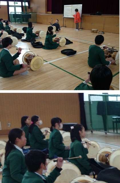 日本の太鼓とは違い、左手と右手のバチの形が違い、にぎり方も違うので戸惑った児童もいましたが、講師の先生の声に合わせて上手に演奏していました。